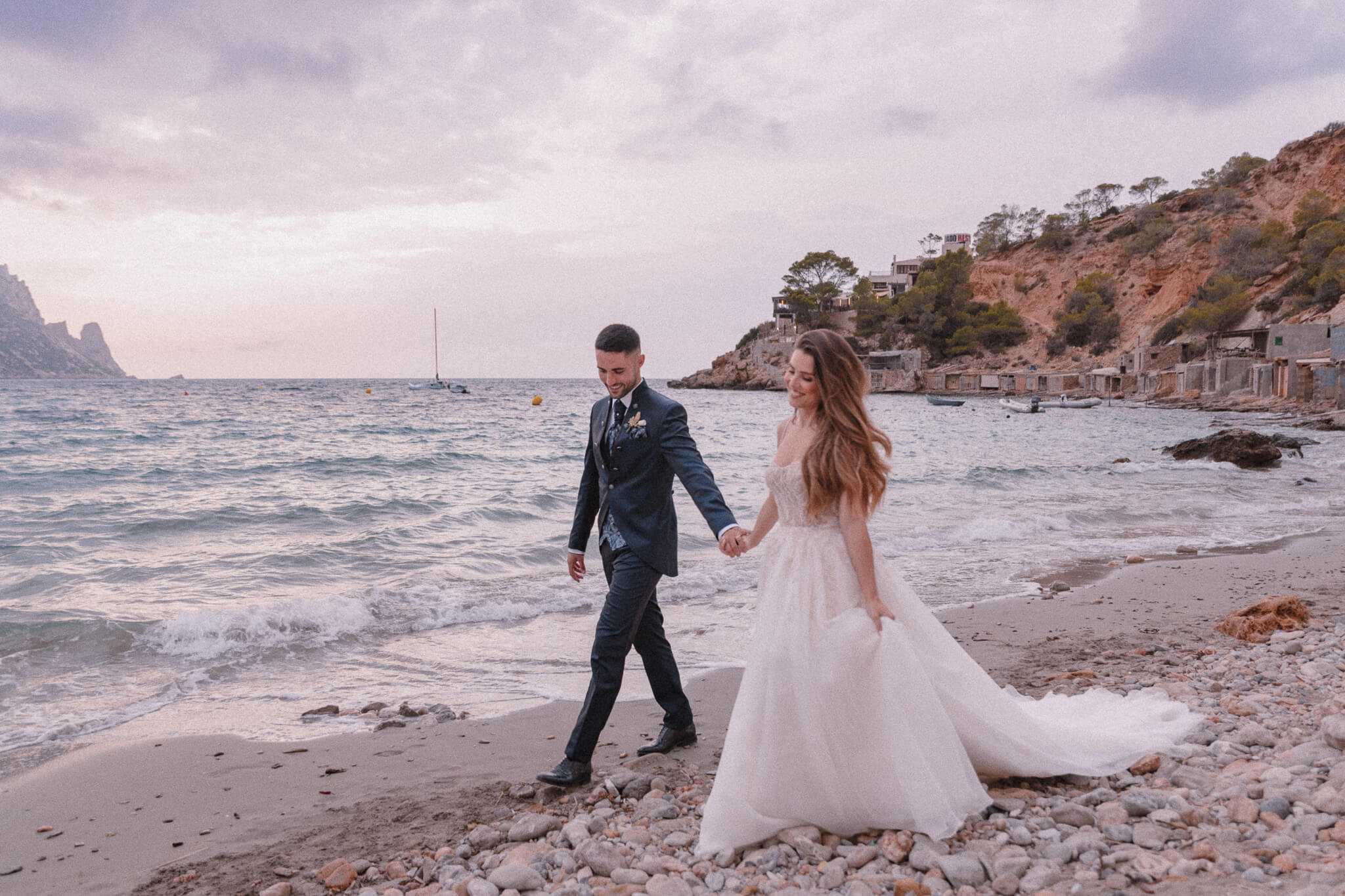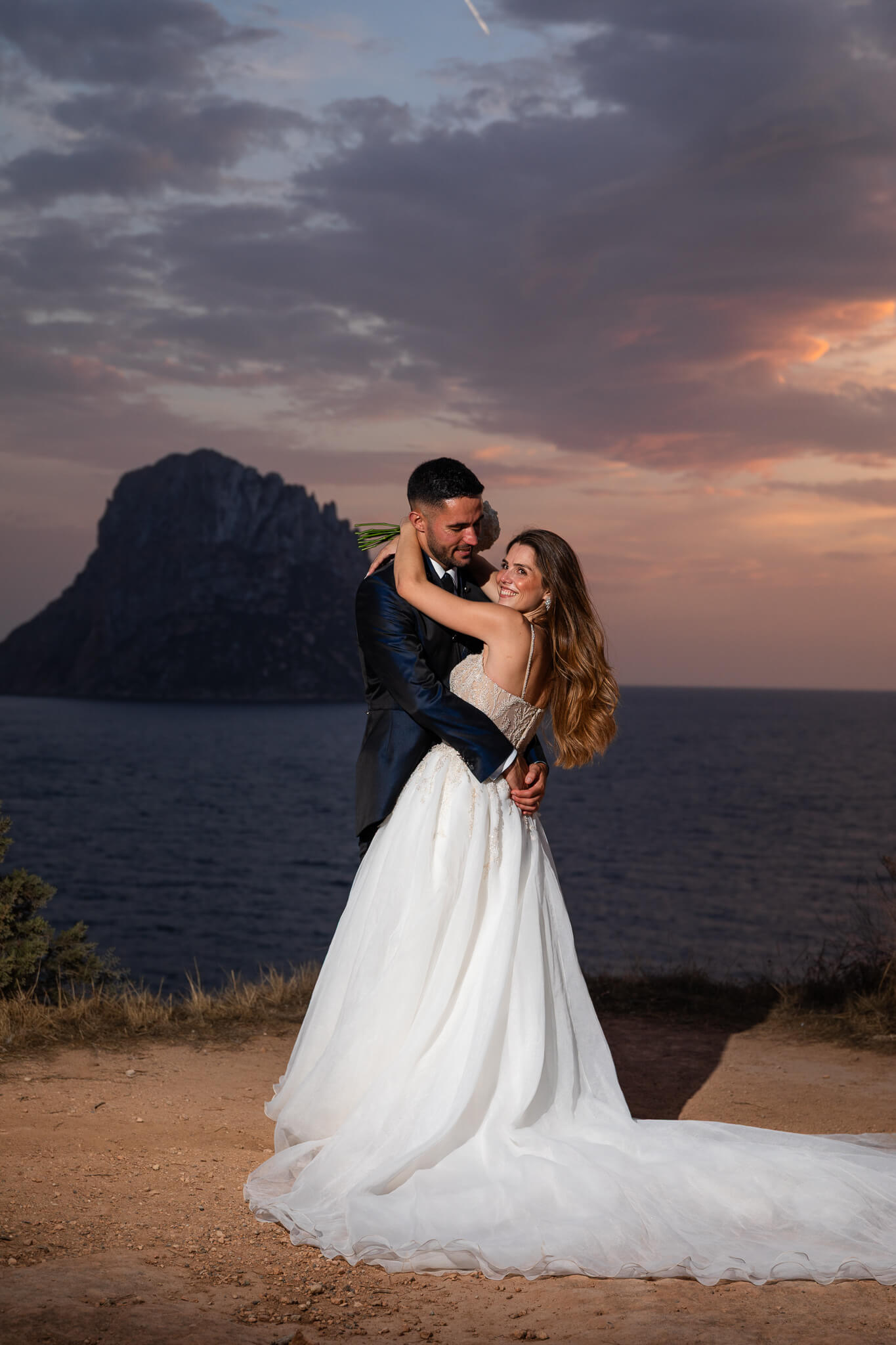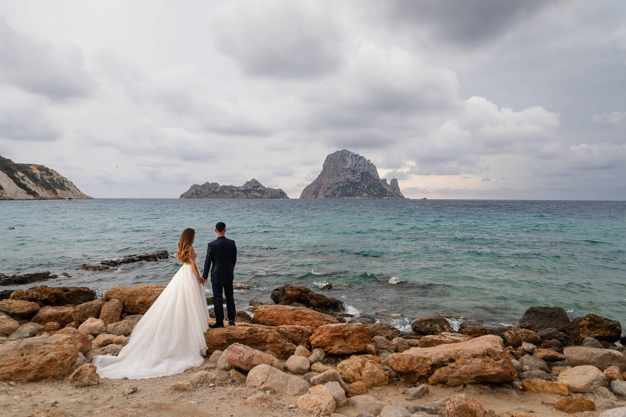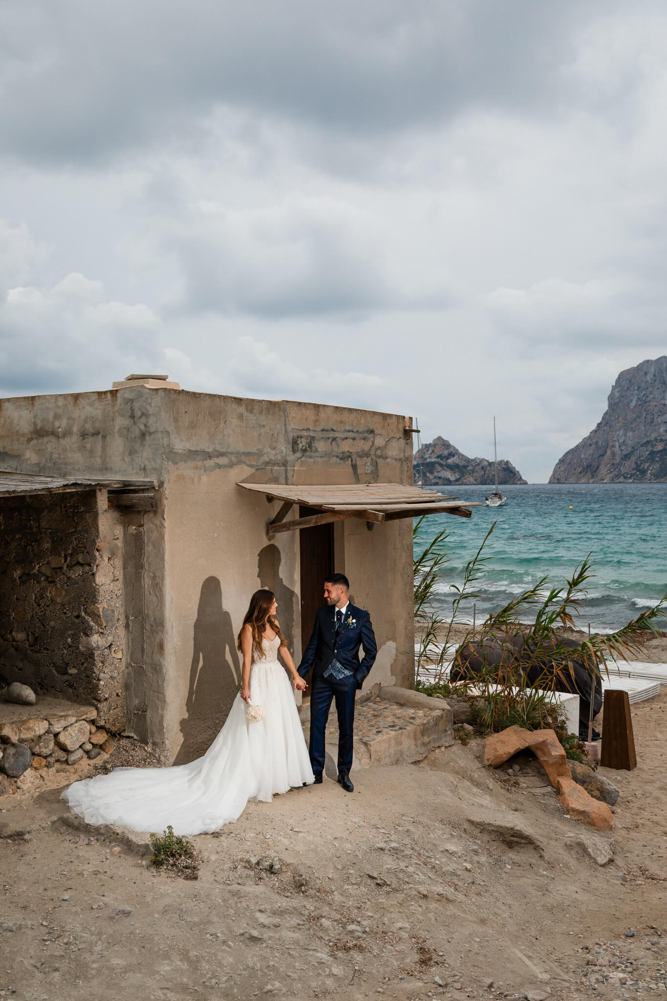 Después de su boda, Marina & Marcel se escaparon desde Barcelona hasta Cala d’Hort para su sesión de postboda. El día amaneció nublado, pero esa luz suave y misteriosa le dio un toque brutal a cada foto.