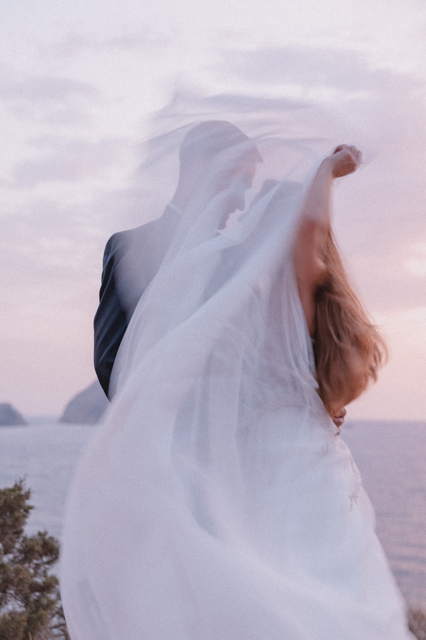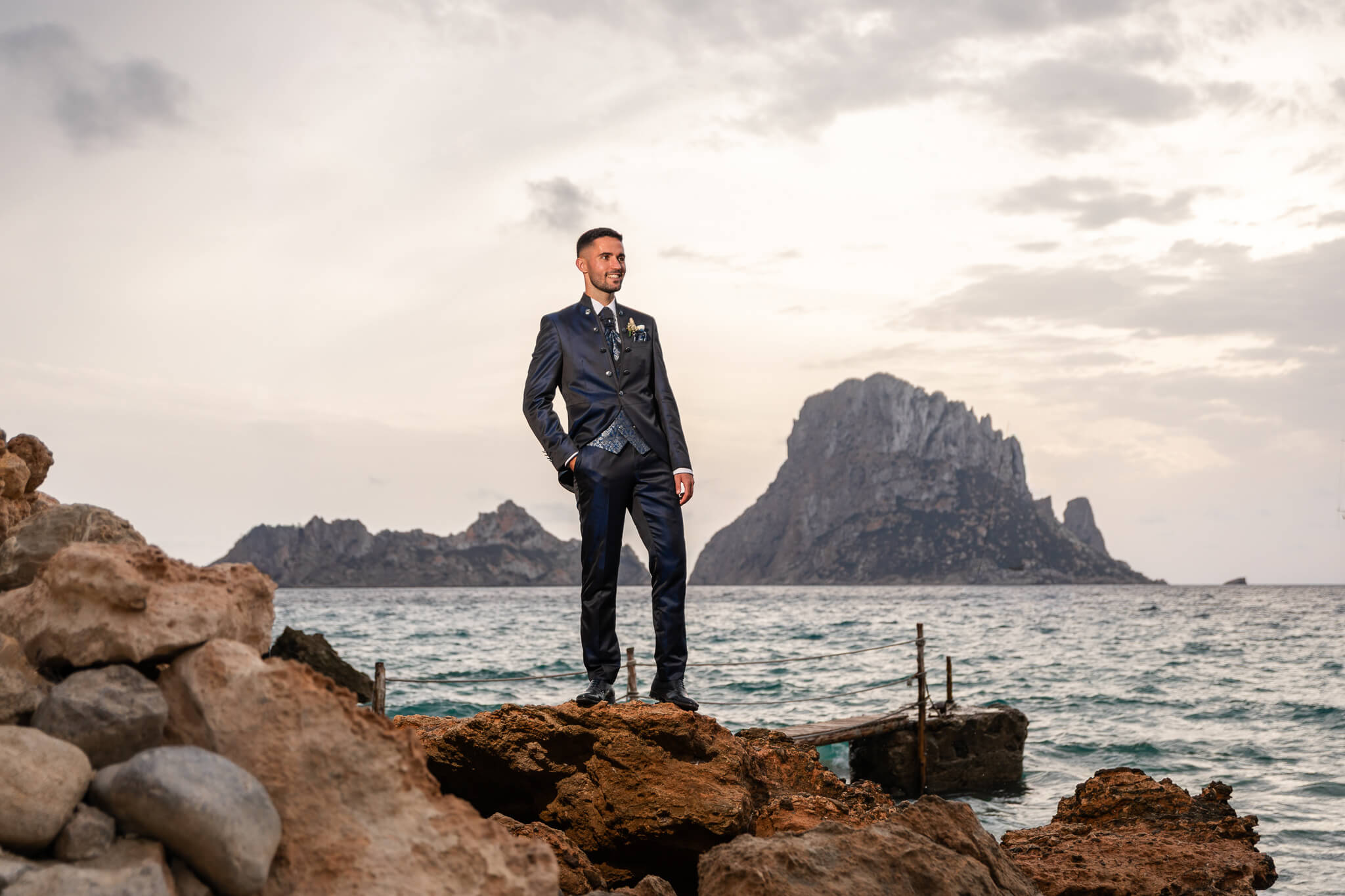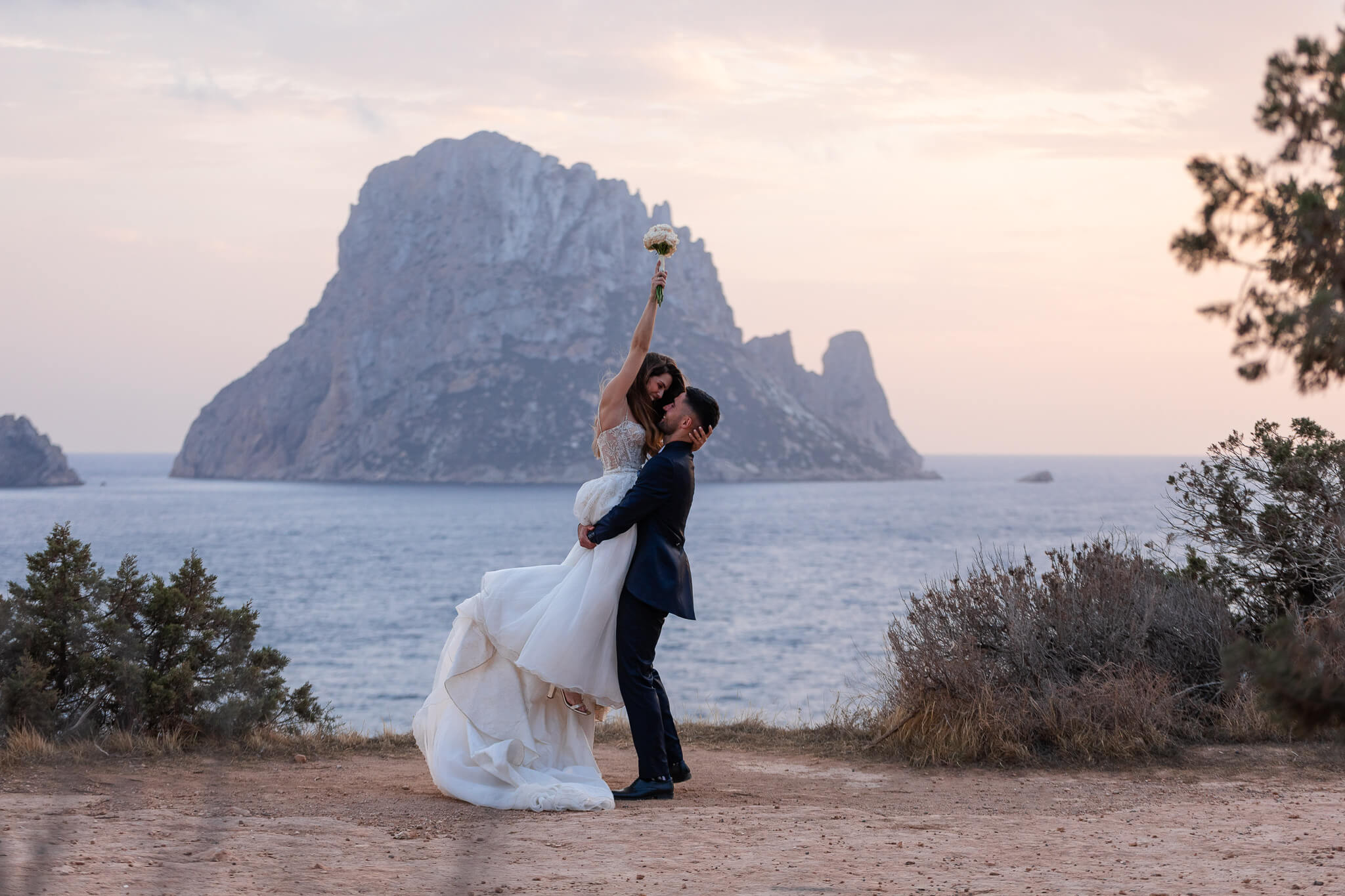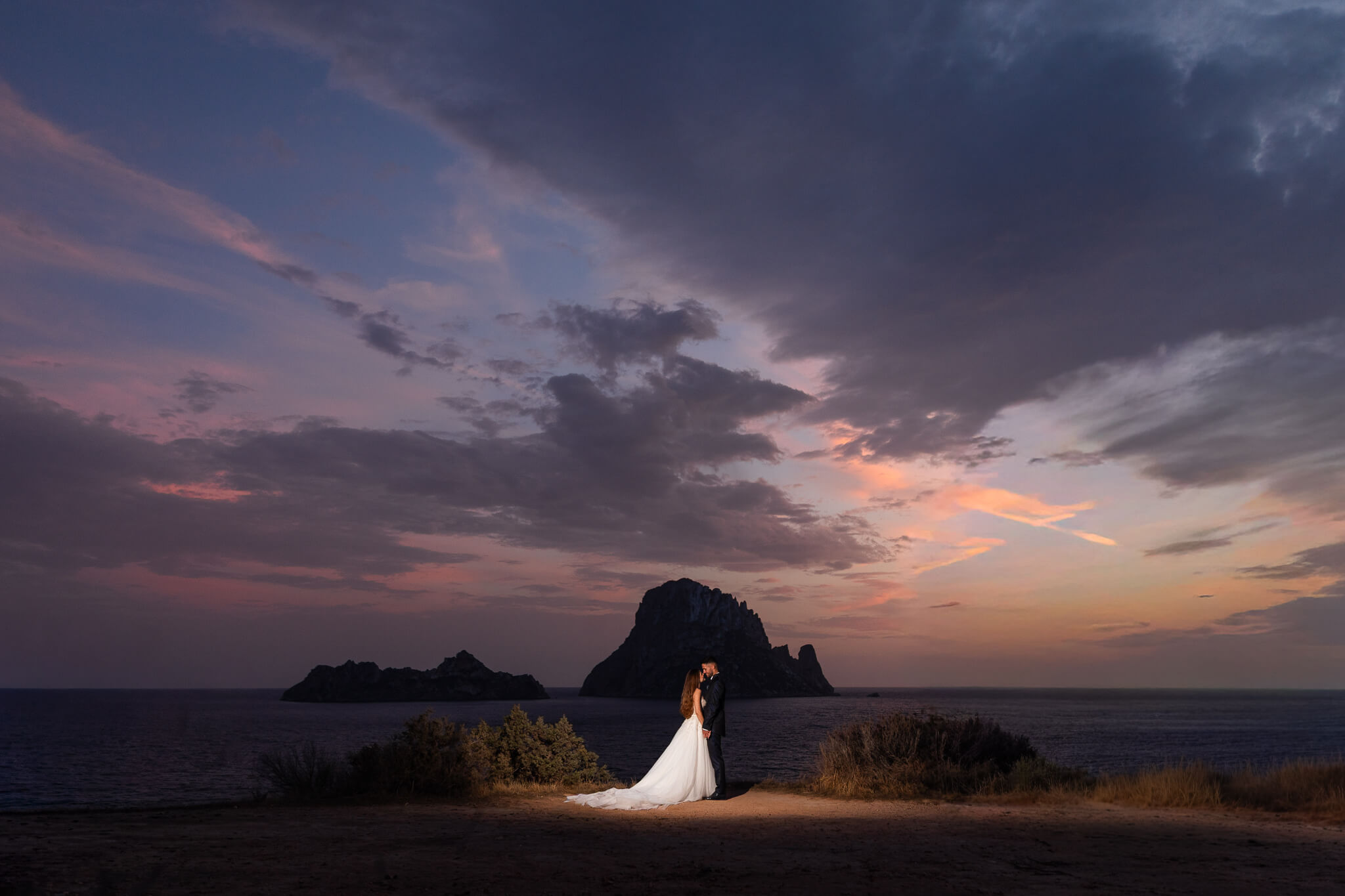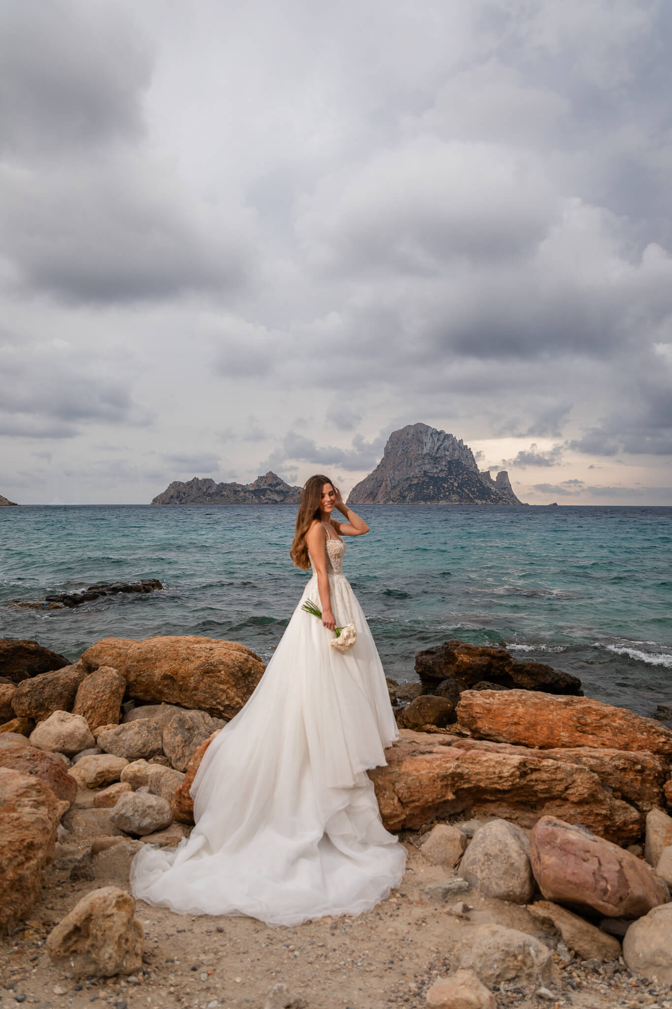 Después de su boda, Marina & Marcel se escaparon desde Barcelona hasta Cala d’Hort para su sesión de postboda. El día amaneció nublado, pero esa luz suave y misteriosa le dio un toque brutal a cada foto.